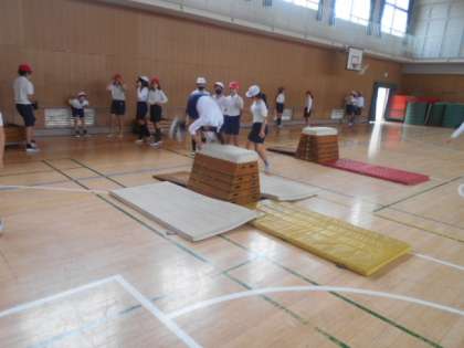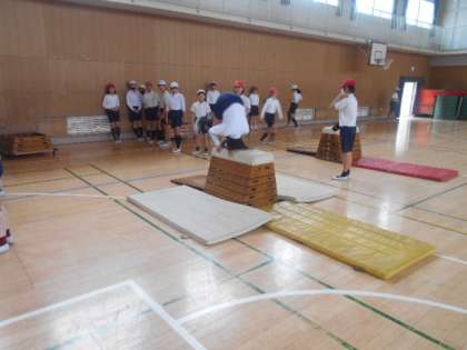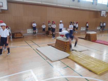台上前転にも自信がついた児童は、頭はね跳びにもチャレンジしています。