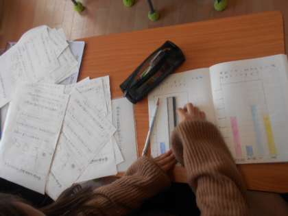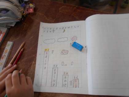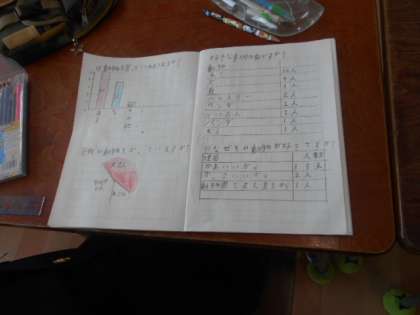 4年1組では国語科「調べたことをほうこくしよう」に取り組んでいました。グループで何について調べるのを決めて、それについてアンケートを取りました。アンケート結果を集計・分析してノートにまとめていました。表や棒グラフを使ったり、見やすいように絵を付け加えたり工夫していました。