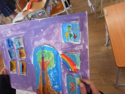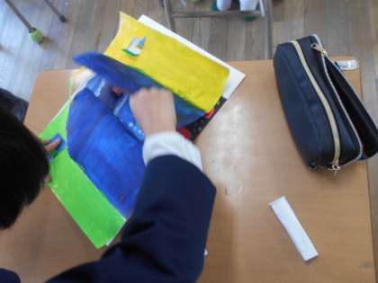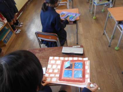 3年2組では図画工作科の時間に「ひらいて広がるふしぎなせかい」に取り組んできました。2枚画用紙を貼り合わせて、窓や扉を開けると、そこから不思議な世界が見えるように工夫されていました。作品を掲示するために、題名と名前を書いて作品に貼っていました。