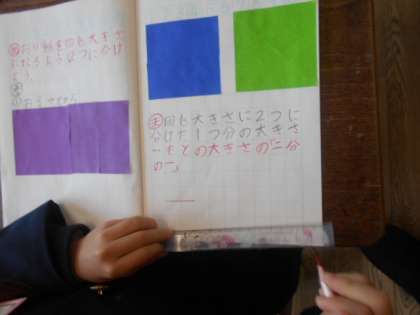 分けた大きさのあらわし方を考えよう 公開日 2024/02/28 更新日 2024/02/28 2年 2年生は算数科「分けた大きさのあらわし方を考えよう」を学習しています。正方形の折り紙を等しい大きさになるように半分に分けます。児童は、折り紙を縦や横、斜めに折って考えていました。 この後、同じ大きさに2つに分けた1つ分の大きさは「1/2」となることを学びました。さしを使って、書き順に気をつけてほしいです。 いいね(0)