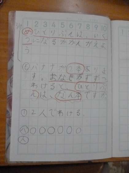 1年1組では算数科「おなじ かずずつ わけよう」を学習していました。12本のバナナを同じ数ずつ分けます。まずは二人で同じ数ずつ分けてみます。バナナをカードに見立てて実際に分けて数を確認しました。では、「3人で同じ数ずつ分けたら……。」「4人で……。」