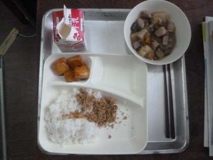 4月9日(火)の給食は、ごはん・牛乳・鶏肉とジャガイモの煮物・厚揚げのしょうゆだれかけ・紅ざけそぼろです。鶏肉とジャガイモの煮物は、ゴボウやにんじん・しいたけがしっかりと煮込まれ、軟らかく食べやすく調理されていました。厚揚げのしょうゆだれかけは、厚揚げに、砂糖・みりん・こいくち醤油で甘辛く味付けされています。紅さけそぼろは、ぱらりとしたふりかけで、ごはんがとても進みます。