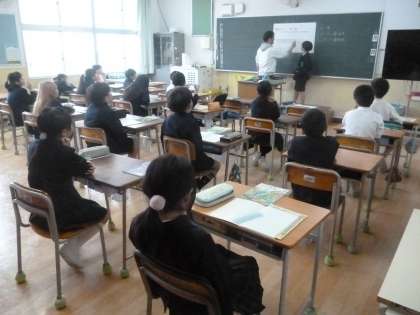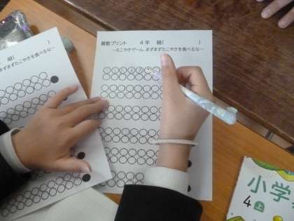 4年1組では算数科の時間に、考えながら勝ち負けを競うゲームに取り組んでいました。たこ焼きを1〜3個ずつ交互に食べていきます。21個目のたこ焼きを食べたら負けのようです。
