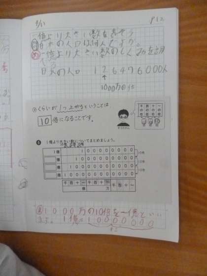 1億より大きい数を表そう 公開日 2024/04/11 更新日 2024/04/11 4年 4年2組では算数科「大きい数」を学習しています。日本の人口は「126476000人」のようです。この数字を読んだり漢数字で表したりします。子どもたちは、苦労しながら考えていました。大きい数には仕組みがあるようです。発見・理解してほしいと思います。 いいね(0)