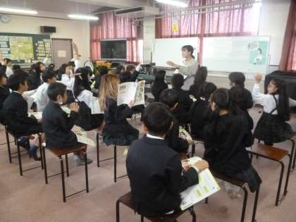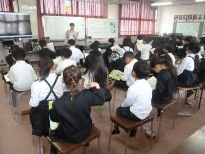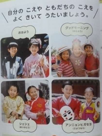 2年生は音楽科「メッセージ」を学習しています。まず、みんなで歌いました。「おはよう」「グッドモーニング」「シエシエ」「アンニョンヒガセヨ」、歌の中にいろいろな外国語が入っています。それぞれどこの国の言葉なのかを発表しあって、もう一度声を合わせて歌っていました。