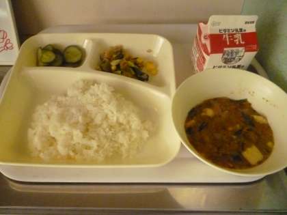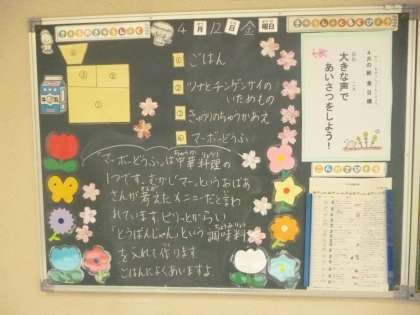 4月12日(金)の給食は、ごはん・牛乳・マーボー豆腐・きゅうりの中華あえ・ツナとチンゲンサイの炒め物です。