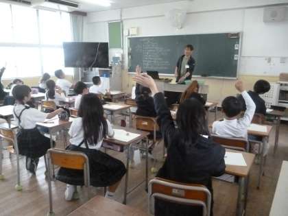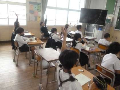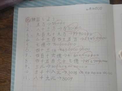 八千九兆 公開日 2024/04/16 更新日 2024/04/16 4年 4年生では算数科「大きな数」を学習しています。「五万」「八十三万」など、思いついた数字を口に出すと、先生が黒板に漢字で板書します。その漢字を見て、子どもたちはノートに漢数字で書き表していました。 「三千十八兆」「八千九兆」、だんだん数字が大きくなって、0の数も増え難しくなります。正確に書くことができたでしょうか。 いいね(0)
