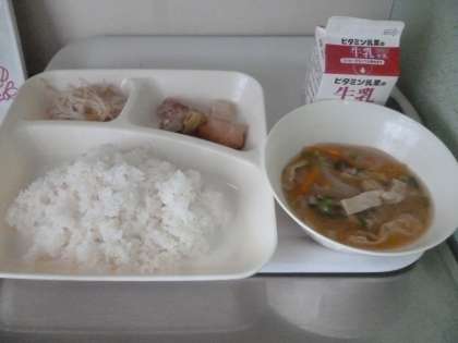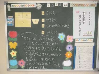 4月18日(木)の給食は、ごはん・牛乳・焼き鳥・みそ汁・もやしとゆずの香あえです。焼き鳥は、しょうが汁が効いており、ふんわりと焼かれています。人気の一品です。