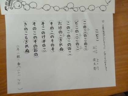 ことこ 公開日 2024/04/22 更新日 2024/04/22 6年 6年2組では、毎週火曜日に行われる朝の視写学習についての指導がありました。「ことこ」という詩を読んで、意味が分かるように区切りを入れました。意味のない言葉が並んでいるような詩でしたが、区切りを入れると不思議に意味がつながってきました。 ていねいに視写をした後は、心を込めて、いい声で音読します。 いいね(0)