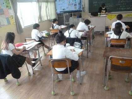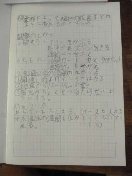 季節による動植物の観察 公開日 2024/04/22 更新日 2024/04/22 4年 4年2組では理科の時間に、季節によって変わる植物の成長や動物の変化を観察する方法について考えていました。服装に配慮し、虫眼鏡や温度計を活用するようです。気温の測り方ひとつとっても、日航が直接当たらないところ、地面から1.5mのところ、風通しの良いところにも気をつけなければいけないことが分かりました。 いいね(0)