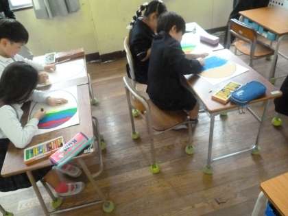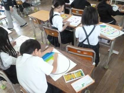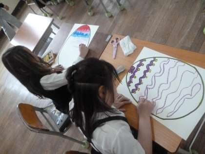 みんながそれぞれ個性的な「ふしぎな たまご」を描いています。もうすぐ完成です。