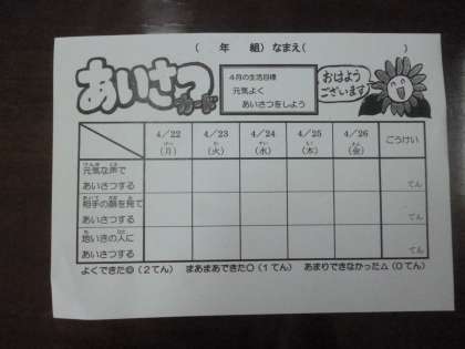 あいさつ週間 公開日 2024/04/22 更新日 2024/04/22 その他 4月22日(月)から26日(金)まで、あいさつ週間です。朝学校前に代表委員児童が立って、あいさつを促していきます。お互いに元気にあいさつを交わしてほしいと思います。 1週間、あいさつカードを記入していきます。「相手の顔を見て」「見守り隊の方々など、地域の人へも」あいさつをしてほしいです。 いいね(0)