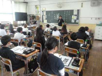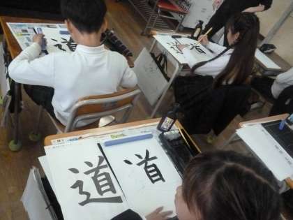 「道」 公開日 2024/04/23 更新日 2024/04/23 5年 5年1組では書写の時間に毛筆で「道」を練習していました。先生から筆の扱いについて特に指導がありました。筆の持ち方、毛先の整え方、墨を含ませる具合、片付け方などです。筆も扱いは、とても大切です。 「道」には気をつけるポイントがたくさんあります。手本を見ながら真剣な表情で練習していました。 いいね(0)