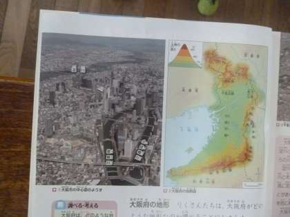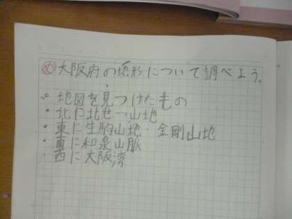 大阪府の地形 公開日 2024/04/23 更新日 2024/04/23 4年 4年2組では社会科の時間に大阪府の地形について調べていました。次のような大阪府の地形図を見て、気がついたことを出し合っていました。「山に囲まれている」という意見が出ました。大阪府の「北は〇〇山地」「東は〇〇山地や●●山地」「南は〇〇山脈」子どもたちは、地形図から見つけていました。では、大阪府の西には……。 いいね(0)
