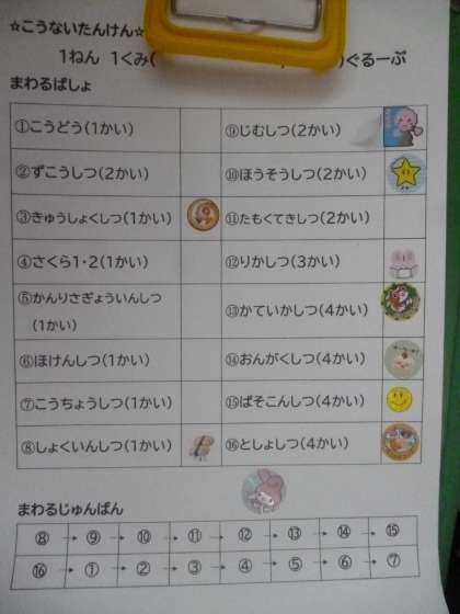 がっこうたんけん1 公開日 2024/04/23 更新日 2024/04/23 1年 1・2年生で活動班になって、「がっこうたんけん」をしました。「こうどう」「ずこうしつ」「きゅうしょくしつ」など、回る順が書かれています。回った場所にシールを貼っていきます。時間内にすべて回ることができたでしょうか。 いいね(0)