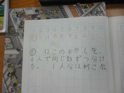 分け方を考えよう 公開日 2024/04/24 更新日 2024/04/24 3年 3年生では算数科「わり算」の学習が始まります。「12個のお菓子を4人で同じ数ずつ分けます。1人分は何個になるでしょうか。」この問題に対して、どんな分け方があるのかを考えていきます。大型テレビの画面を観ながら、具体的な操作で考えていました。 いいね(0)
