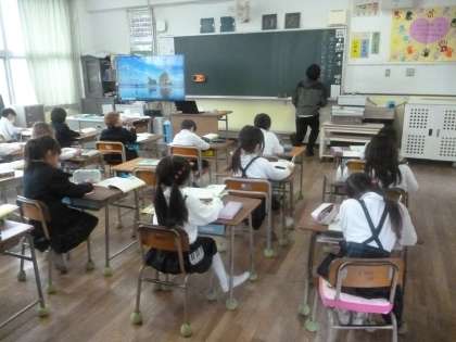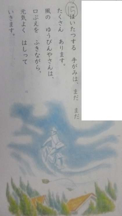 2年1組では国語科「風のゆうびんささん」を学習しています。最後の第6段落での「風のゆうびんやさん」の思いを考えます。「口ぶえを ふきながら」「元気よく」ヒントとなる言葉があるようです。挿絵も大いに参考になるようです。