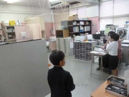 1年生は、10人ずつ保健室へ移動して視力検査を受けていました。お友だちが検査している間、静かに待つことができました。