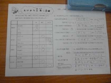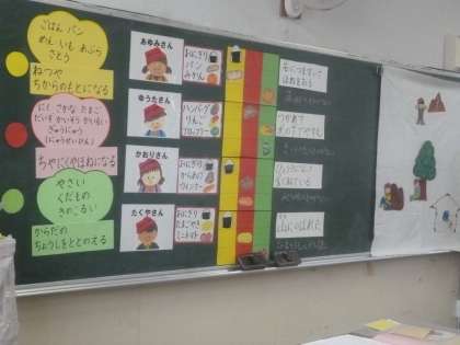 えいよう3色 公開日 2024/04/24 更新日 2024/04/24 2年 2年2組では食育「えいよう3色」を学習していました。4人がお弁当を持って山登りしますが、そのうち3人は、疲れたり石につまずいたり病気になったりして山頂まで登れませんでした。そこには、栄養バランスの良いお弁当を持って行ったかと関係があるようです。元気に活動するために、食事面で大切なことに気づけたでしょうか。 いいね(0)