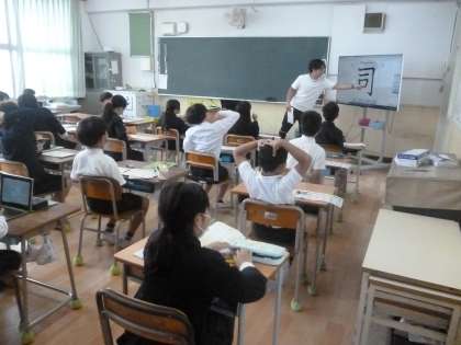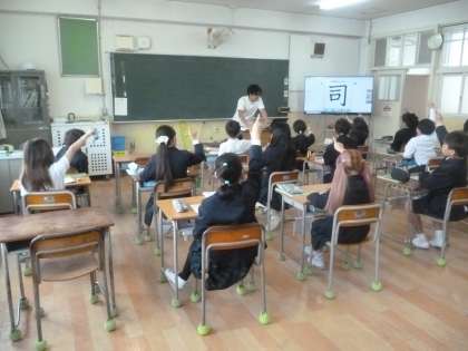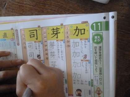 4年1組では国語科の時間に、新出漢字「加」「芽」「司」を学んでいました。「加」は平仮名「か」の基になる漢字なので、左右のバランスが大事です。「芽」はくさかんむりの下の部分の大きさが大きくなりすぎないように、気をつけながら丁寧に練習していました。