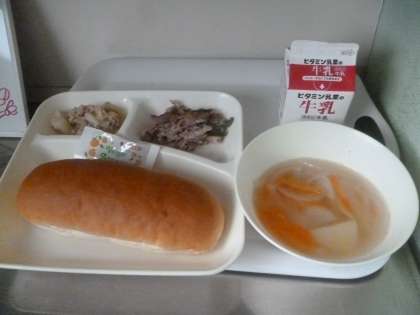 4月30日(火)の給食は、コッペパン・アプリコットジャム・牛乳・豚肉のガーリック焼き・スープ・ツナとキャベツのソテーです。