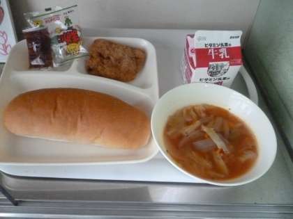 5月8日(水)の給食は、コッペパン・いちごジャム・牛乳・一口とんかつ・ミネストローネ・豆こんぶです。