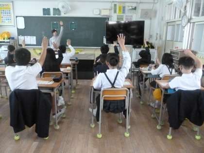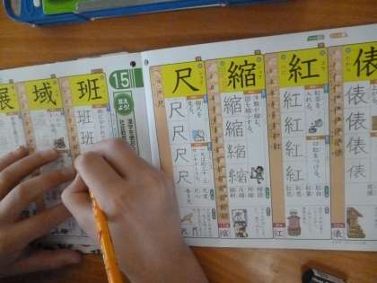 6年1組では国語科の時間に、新出漢字「尺」「班」を習っていました。「班」の部首は「たまへん」というそうです。「リ」の左右に「王」が並んでいますが、大きさや形が少し違います。バランスを取りながら漢字ドリルに練習していました。