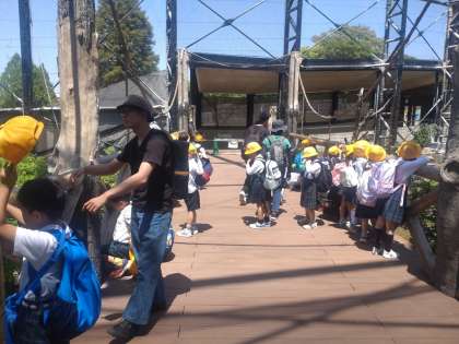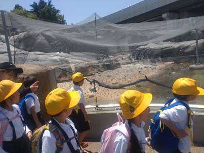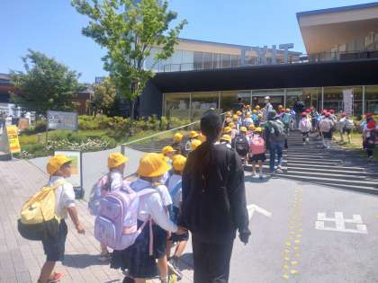 遠足も終わりの時刻が来ました。がんばって、たくさん歩いたので、疲れたようです。これからバスに乗って、学校へ戻ります。