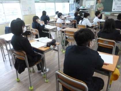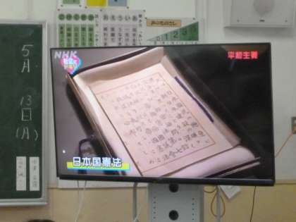 6年2組では社会科の時間に日本国憲法3原則のひとつ「平和主義」についての映像を観ていました。日本国憲法の中に「平和主義」に関する条文がうたわれるようになった経緯、「平和主義」を貫く大切さ、そして、現在も暮らしの中に見えてくる「平和主義」について知ることができたようです。