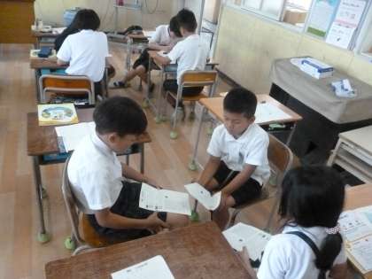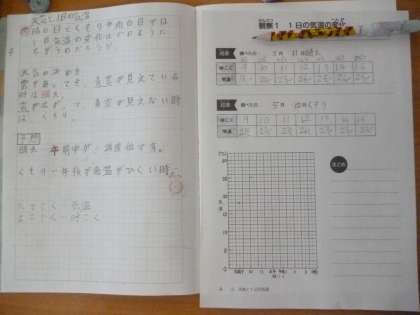 1日の気温の変化 公開日 2024/05/21 更新日 2024/05/21 4年 4年1組では理科の時間に、晴れと日と曇りの日での1日の気温の変化について調べていました。まずは1日の「時刻」と「気温」の変化を表す表を、折れ線グラフでかき写します。まず「5月12日曇り、午前9時・21度」折れ線グラフ上に正確に点を打てたでしょうか。グループで確認していました。 いいね(0)