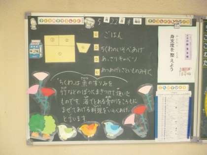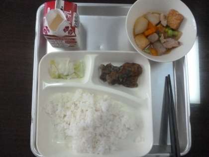 5月22日(水)の給食は、ご飯・牛乳・厚揚げとさといもの味噌煮・ちくわの磯部揚げ・あっさりキャベツです。