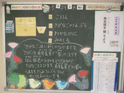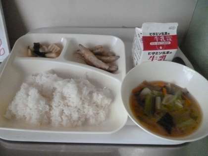 5月29日(水)の給食は、ご飯・牛乳・きびなごてんぷら・みそ汁・わかたけ煮です。