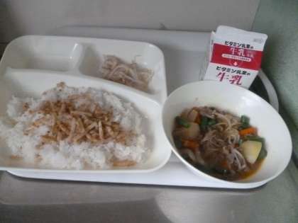 5月31日(金)の給食は、ごはん・牛乳・みそ肉じゃが・もやしの甘酢あえ・ゴマかか炒めです。