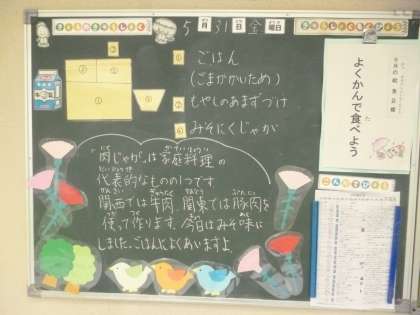みそ肉じゃがは、牛肉や糸こんにゃくと一緒に、じゃがいもが軟らかくなるまで煮こんでいます。仕上げは、赤みそで味を調えています。肉じゃがは、それぞれの家庭で自慢の味付けをしていると思いますが、給食の肉じゃがもなかなか美味しいです。
