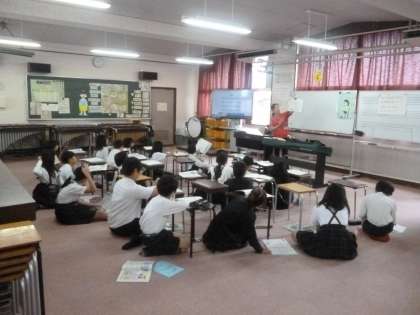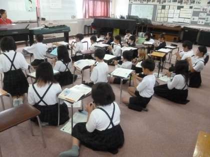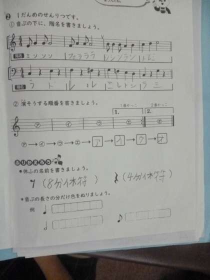 茶色の小びん 公開日 2024/05/31 更新日 2024/05/31 5年 5年2組では音楽科「茶色の小びん」リコーダー演奏のテストをします。順番を待っている間、「茶色の小びん」についてのワークシートを解いていきます。階名・演奏する順番・休符名・音符の長さが問われています。 では、全員でリコーダー演奏した後、テストの開始です。 いいね(0)