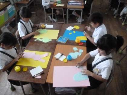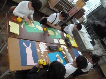貼り絵 公開日 2024/05/31 更新日 2024/05/31 3年 3年生は図画工作科の時間に、動物の貼り絵に取り組んでいました。色画用紙を切って、「しっぽ」「体」「顔・耳」と貼り合わせていました。「犬」「うさぎ」などの素敵な動物が形作られてきました。 この後、模様を折り紙で貼ったり、白い紙で丸く切った目をつけたりしていくようです。まだ「手は付けない」という約束です。手をどのようにするのか楽しみです。 いいね(0)