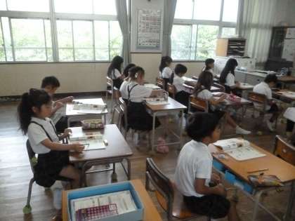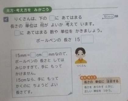 2年2組では算数科の時間に次のような問題に取り組んでいました。□に当てはまるのはmmでしょうか。cmでしょうか。15mmは1cm5mmで、字を書くには短すぎるようです。15cm、ボールペンほどの長さの感覚、実感できたでしょうか。