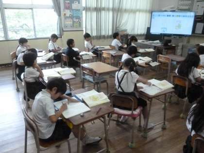 2年1組では国語科「名前を 見て ちょうだい」の場面分けを考えていました。場面分けには3つのポイントがあるようです。「時」「場所」「人物」に変化がある時は、場面が変わっていることが少なくないようです。キーになる言葉を頼りに考えていました。
