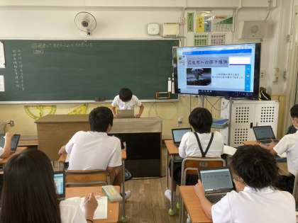日本国憲法と政治 公開日 2024/06/04 更新日 2024/06/04 6年 6年生は社会科で、「日本国憲法と政治」について学習してきました。1組では、「日本国憲法と政治」これまで学習してきて分かったことや考えたことを発表ノートにまとめていました。子どもたちは、図や表・写真を使いながら、大型テレビに映して説明していました。また、お友だちの発表を聞いて、よいところを見つけようとしていました。 いいね(0)