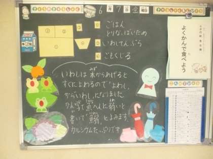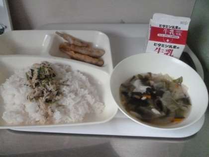6月7日(金)の給食は、ご飯・牛乳・いわしてんぷら・五目汁・とりなっ葉炒めです。
