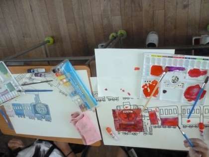 銀河鉄道の夜 公開日 2024/06/07 更新日 2024/06/07 6年 6年1組では図画工作科の時間に「銀河鉄道の夜」の絵の下描きが終わり、色を塗っていました。汽車の色を出すために、絵の具の水加減や色合いを微妙に変化付けながら塗っていきます。鉄が錆びた感じをうまく表現していました。 いいね(0)
