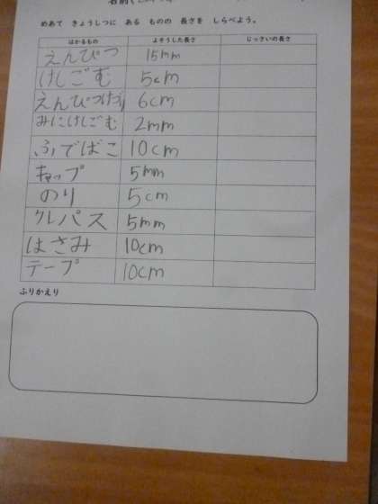 身の回りの長さ調べ 公開日 2024/06/07 更新日 2024/06/07 2年 2年1組では算数科の時間に教室内にある物の長さ調べをします。先生が持っている携帯電話の縦の長さを調べます。まずは予想、12cm〜15cmの間に分かれましたが、測ってみると実際は「15cm」でした。 ワークシートに測りたい物とその長さを描いていきます。筆箱・消しゴムなど、次々に測っていきました。 いいね(0)