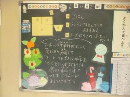6月11日(火)の給食は、ご飯・牛乳・マーボー春雨・チンゲンサイともやしの甘酢あえ・抹茶大豆です。