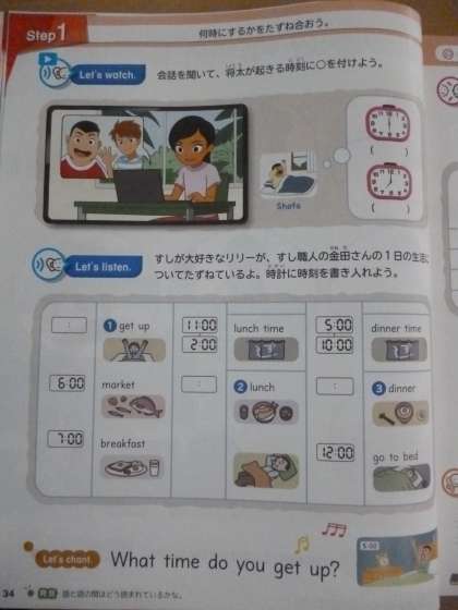 何時にするかをたずね合おう 公開日 2024/06/11 更新日 2024/06/11 6年 6年2組では英語科「何時にするかをたずね合おう」を学習しています。「すし職人金田さんの1日、午後〇時に〜をした」を英語でヒアリングしていきます。起きた時刻・昼食を食べた時刻、子どもたちはよく聞けていました。 次は「What time do you get up?」「I get up at 〇〇.」英会話について練習していました。 いいね(0)