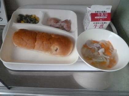 6月13日(木)の給食は、おさつパン・牛乳・鶏肉のガーリック焼き・スープ・さんど豆とコーンのサラダです。