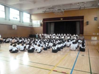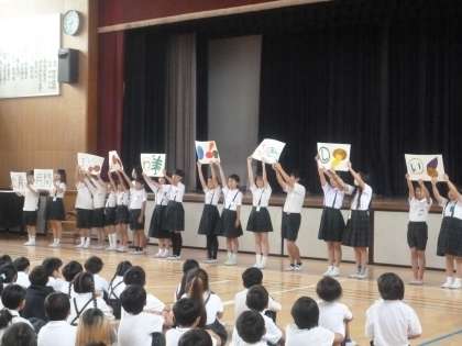 6月13日(木)児童集会では、給食委員会による発表がありました。6月は食育月間です。食育月間にちなんで、食育に大切な合言葉「まごわ(は)やさしい」についての発表でした。「ま」は「豆類」・「五」は「ゴマ類」・「わ」は「わかめなど海藻類」・「や」は「野菜」・「さ」は「魚」・「し」は「しいたけなどキノコ類」・「い」は「イモ類」を表します。合言葉「まごわ(は)やさしい」は、健康な食生活を過ごすうえで大切な食材を表しています。