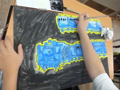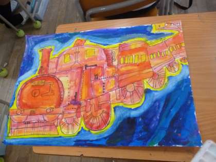 銀河鉄道の夜 公開日 2024/06/17 更新日 2024/06/17 6年 6年2組では図画工作科で取り組んできた「銀河鉄道の夜」の絵ができ上がってきました。星が輝く夜空に、鉄色に輝いて走っている汽車の様子が、絵の具のタッチや水の加減を利用して、うまく描かれていました。 いいね(0)