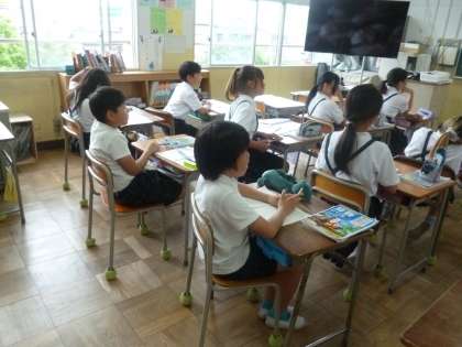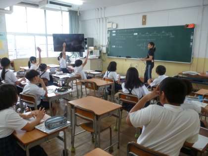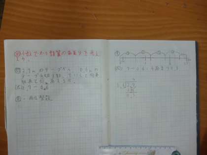 5年2組では「2.7mのテープから0.6mのテープを切り取っていくと、何本取れて何m余りますか。」の問題に取り組んでいました。「2.7÷0.6」を筆算で計算します。小数点を移動して「27÷6=4あまり3」になりました。「答え4本取れて3m余る。」あれ、3mの中に0.6mがまだ切り取れます。