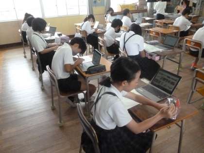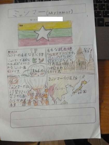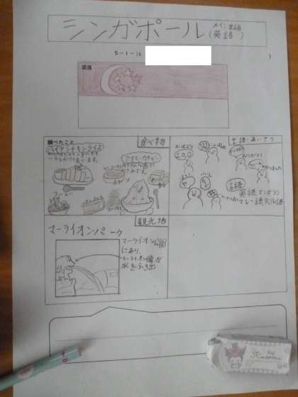 5年1組では、世界の国々をタブレットで調べ、ワークシートにまとめてきました。アジアの身近な国々から、アメリカ・ヨーロッパ大陸の国まで、いろいろな国を調べ、多くの児童が完成に近づいているようです。。食べ物・観光地や世界遺産・祭りやイベント・言葉など、幅広く丁寧に調べていました。