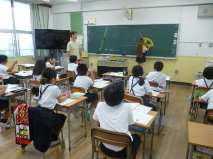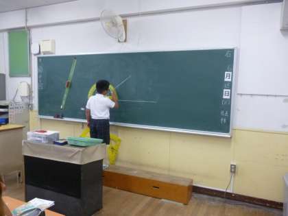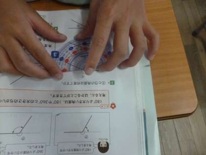 4年2組では算数科「角と角度」を学習しています。前時までに、角度について学んだようです。本時では、実際に分度器を使って角度を測っていきます。段々問題も難しくなってきて、90度以上の角度、また、180度以上の角も測る必要があります。先生から180度以上の角を測る時は、1本補助線を引くと良いことを教えていただきました。